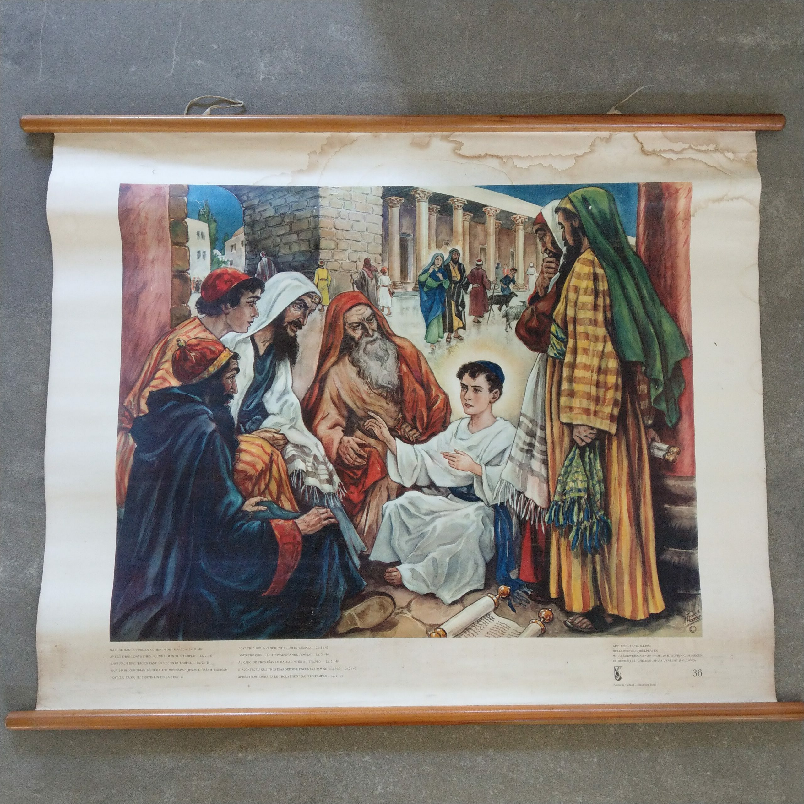 Schoolplaat over het Bijbelverhaal van Jezus die in de tempel achterbleef en na 3 dagen teruggevonden wordt.