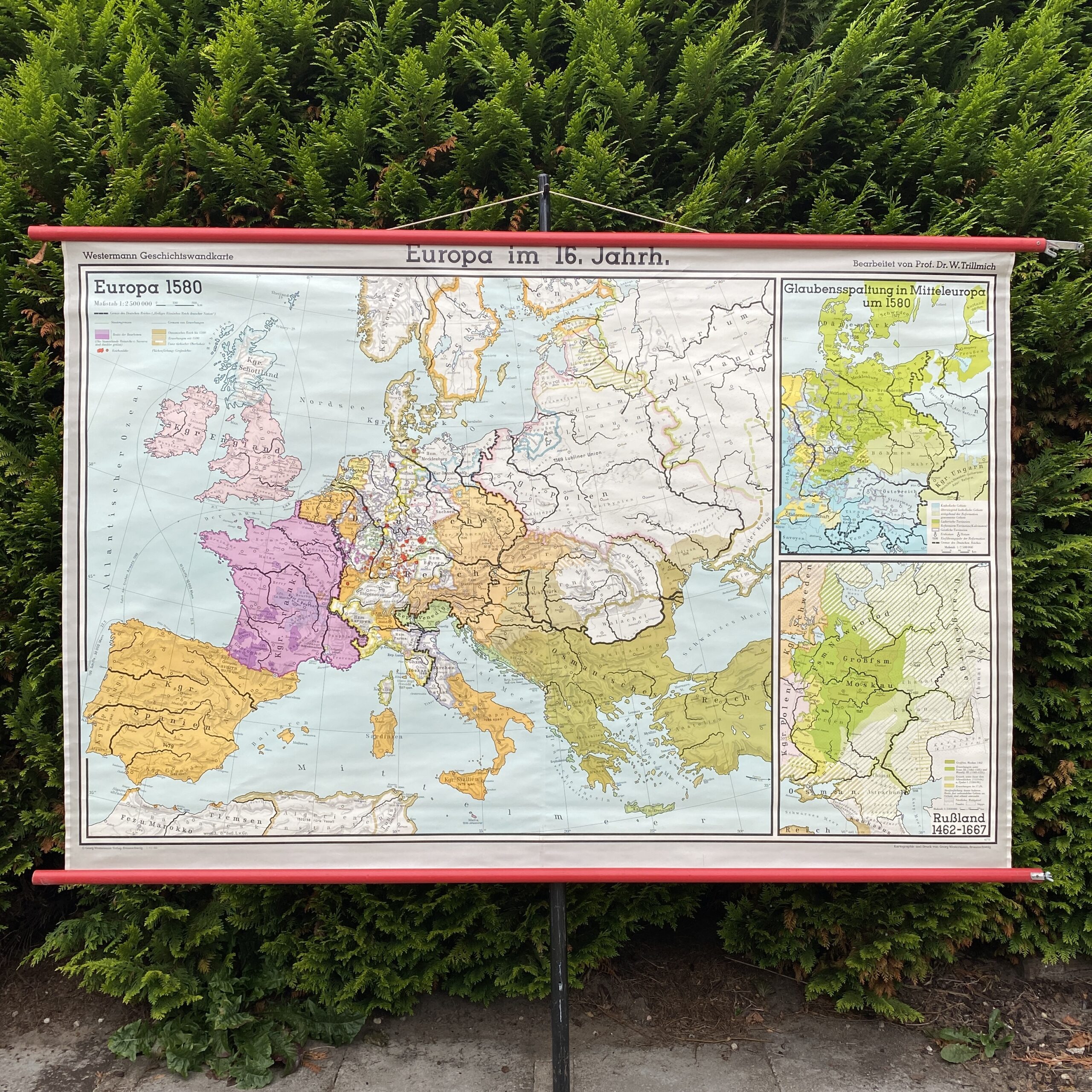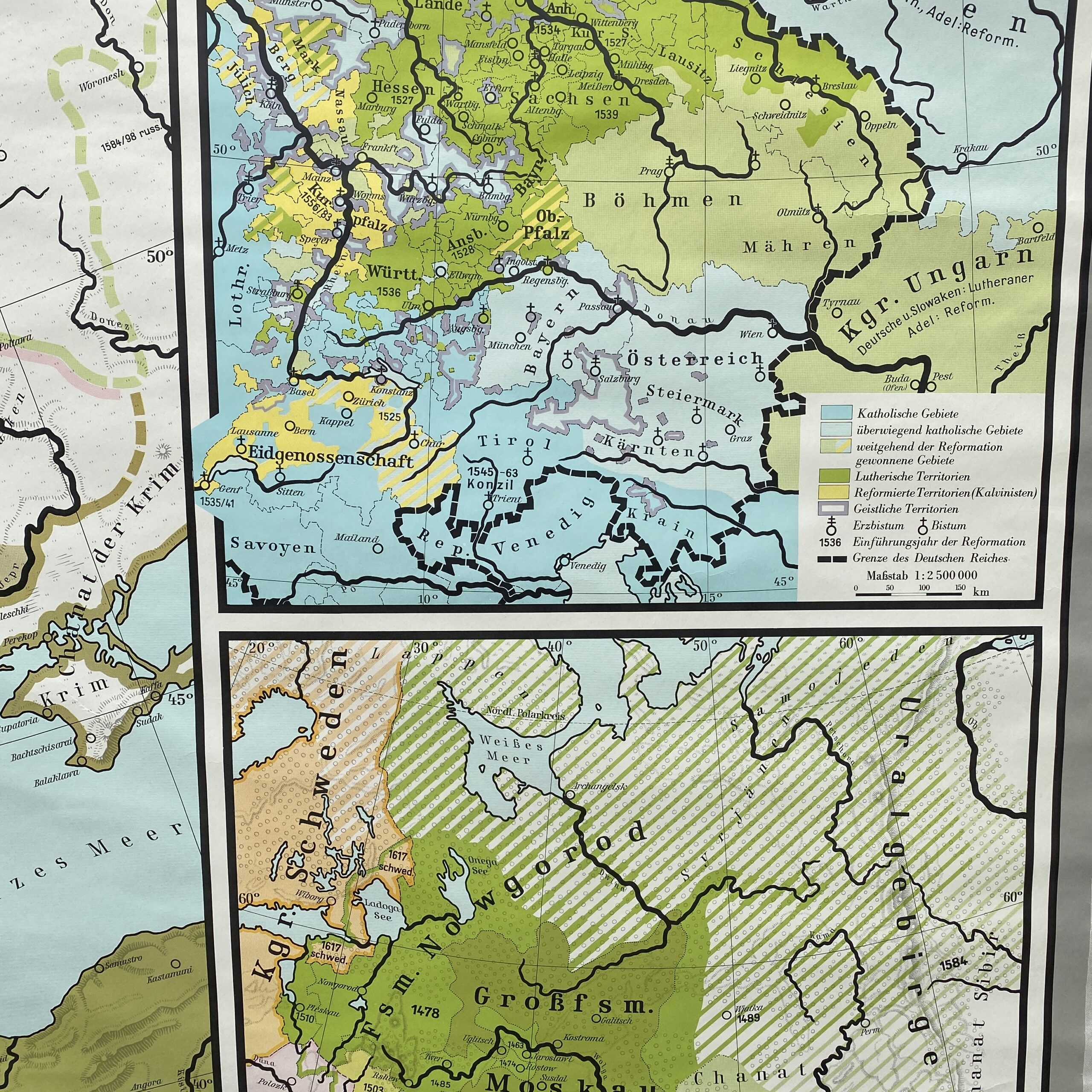 Op deze kaart een hoofdkaart – Europa in 1580 en twee bijkaarten: Schisma (verdeelheid in geloof) in Midden-Europa 1580 en Rusland 1462 – 1667.