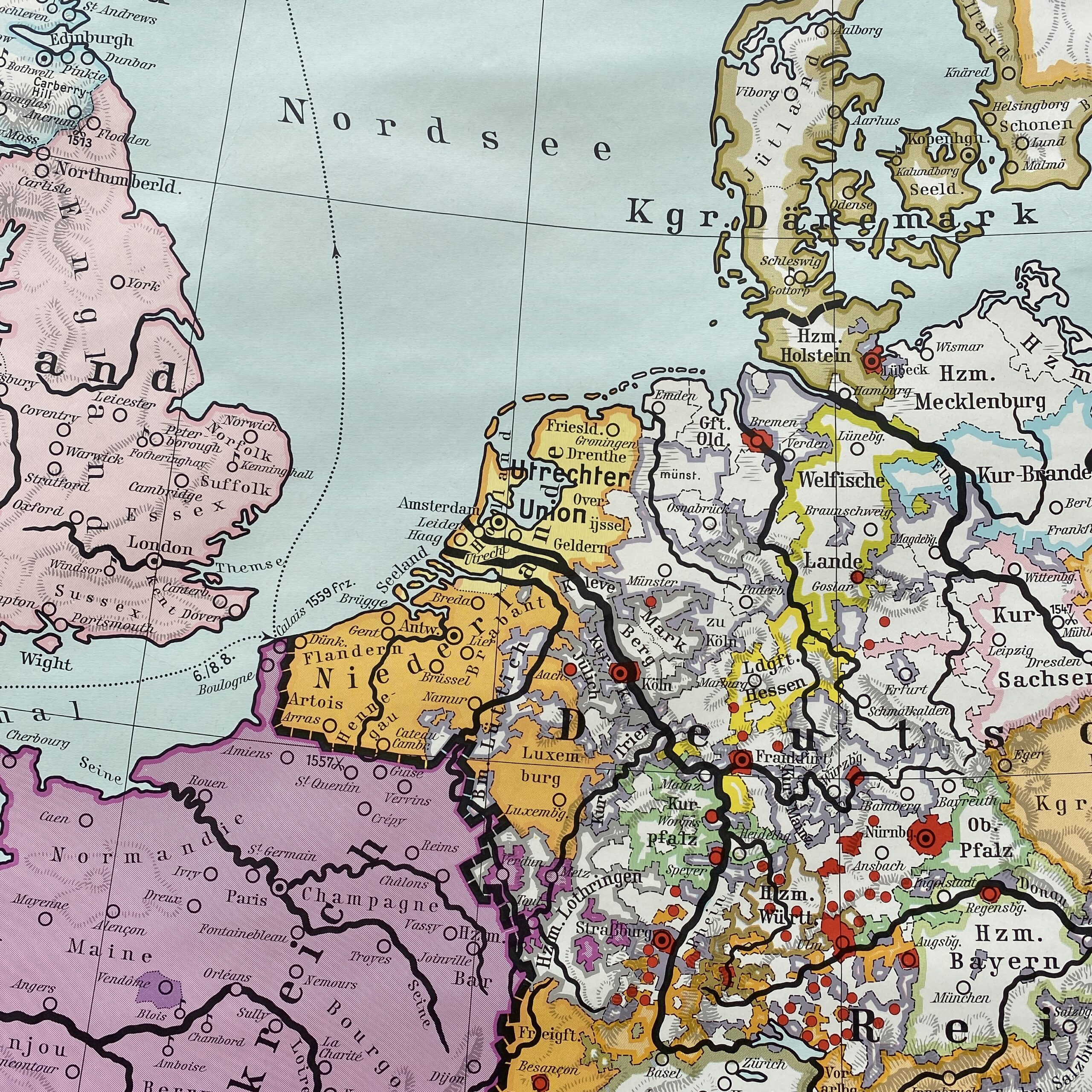 Prachtige grote wandkaart van Europa in de 16e eeuw, in 1980 uitgegeven door Westermann. De kaart is in prima staat.