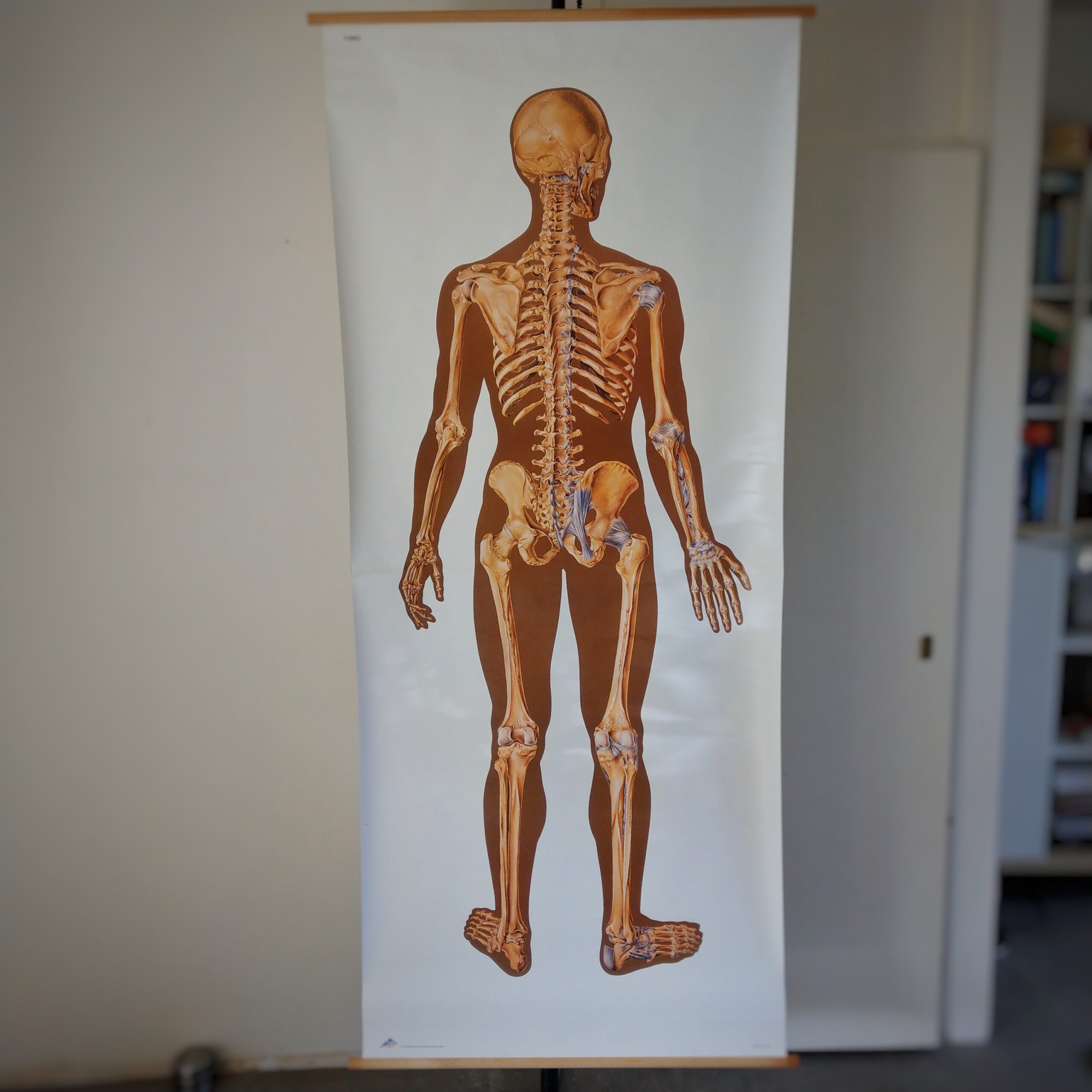 Fraaie medische schoolplaat van het menselijk geraamte van de achterkant op ware grootte. Zo kan je extra goed zien waar alle botten zich bevinden.