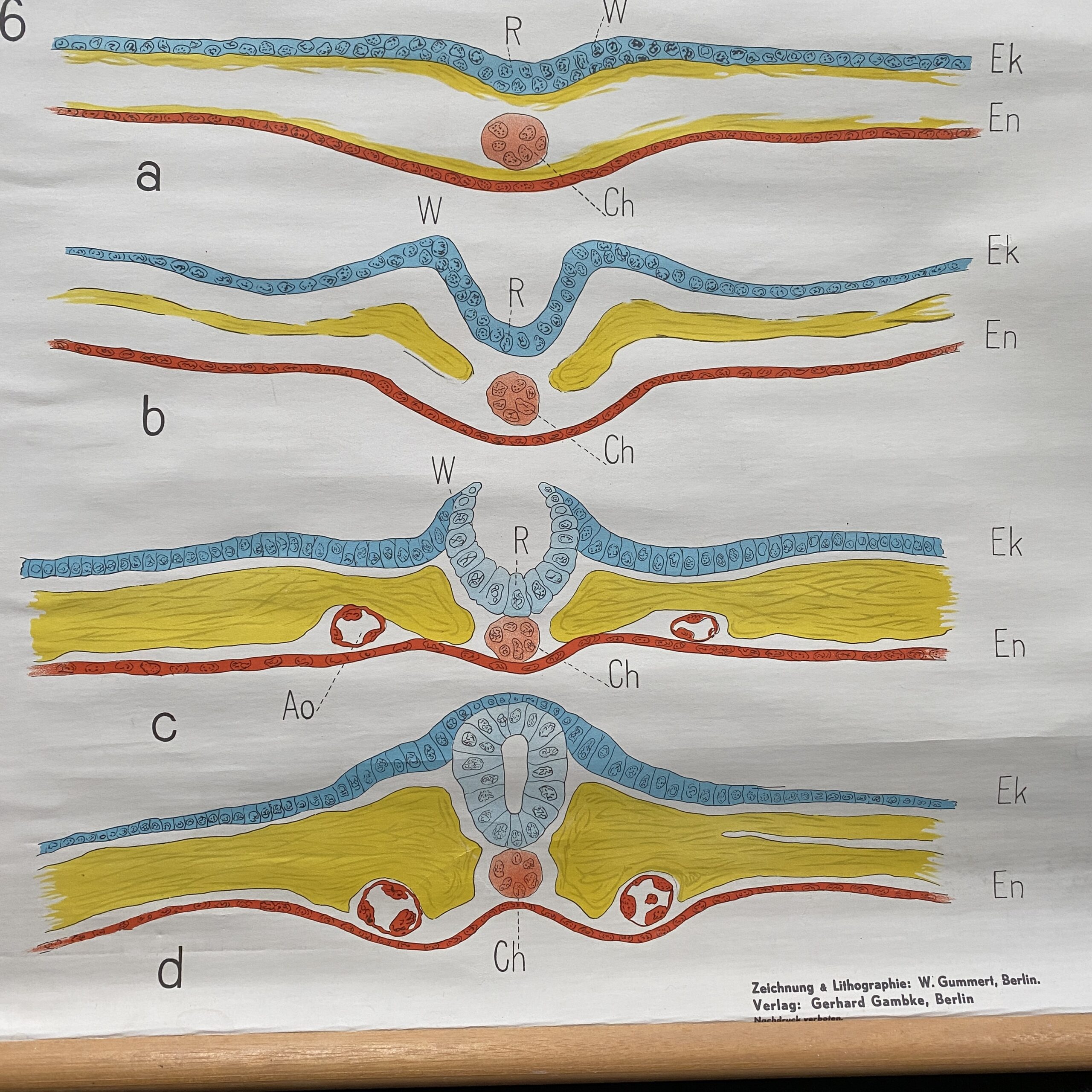 Uit 1928 zien we hier de schoolplaat ' Furchung & äussere Gesamtgestaltung des Embryos'. Het is een plaat uit de serie 'Histologische embryologische Tafeln' van illustrator Gerhard Gambke. Gezien de leeftijd (1928) verkeert dit exemplaar in een zeer goede vintage staat.